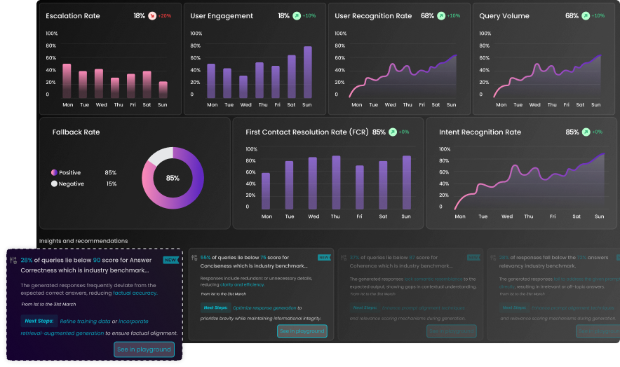 Identify error patterns with live monitoring, refine responses using contextual feedback, and build evaluations to systematically reduce hallucinations over time.