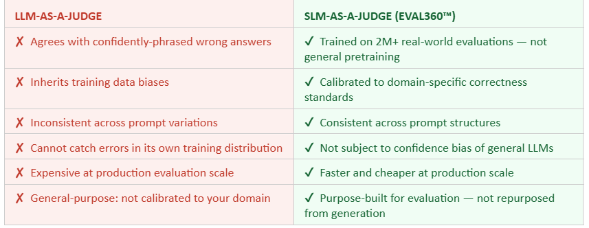 LLM-as-a-Judge uses a general-purpose frontier model trained primarily to generate text  to evaluate other models’ outputs. It suffers from confidence bias, inherits training data biases, and is not calibrated to domain-specific correctness standards. SLM-as-a-Judge uses a small model trained specifically on evaluation tasks, making it more accurate, faster, cheaper, and free from generative biases. LLUMO AI’s Eval360™ is trained on 2M+ real-world evaluations.
